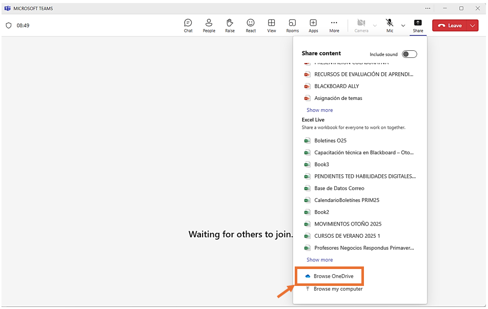 Durante una reunión en Microsoft Teams, es posible compartir documentos guardados en OneDrive para que los participantes trabajen juntos en tiempo real. Esta función resulta especialmente útil en el desarrollo de clases.