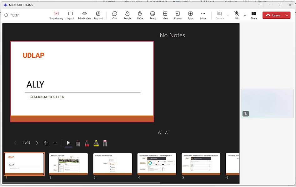 1. Dentro de la reunión, selecciona el botón Compartir/Share (ícono de una flecha hacia arriba ⬆️ en la barra de herramientas).