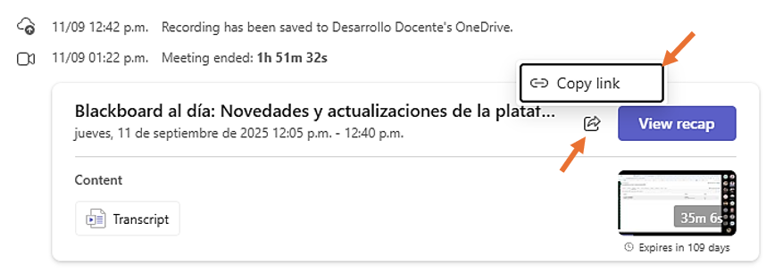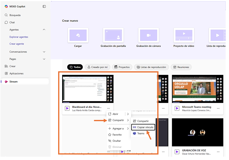 4. Una vez dentro de Stream, ubica la grabación que deseas compartir, haz clic en los tres puntos de la grabación, después haz clic en compartir y finalmente selecciona copiar vinculo/copy link.