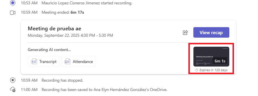 Después de haber ingresado a su sesión y una vez que se ha detenido la grabación y se ha terminado la sesión dentro de Microsoft Teams, la plataforma hará llegar un mensaje dentro del chat que la grabación se encuentra disponible.