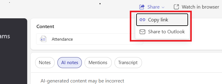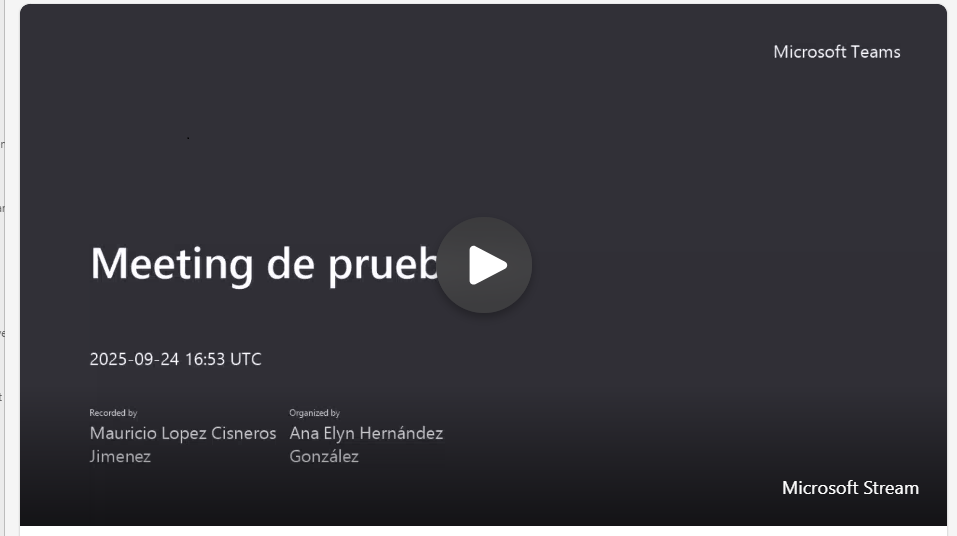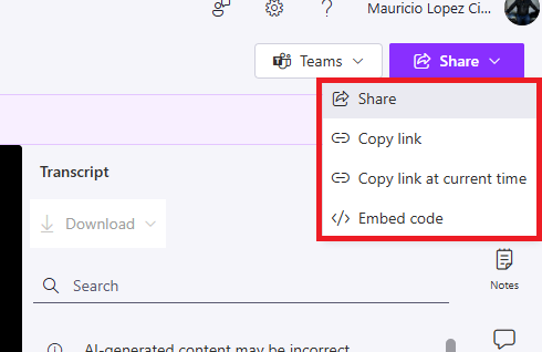 Del lado superior derecho se mostrará la opción para copiar el enlace hacia la grabación o compartirla por medio de Outlook, también se cuenta con la opción para abrir en el navegador