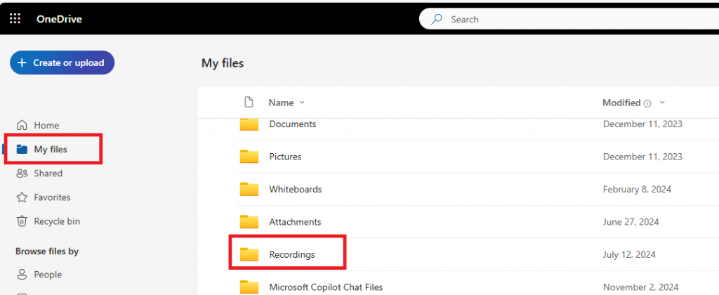 Del lado izquierdo deberá ingresar al apartado de Mis Archivos o My files con su cuenta institucional y posteriormente a la carpeta de Recordings.