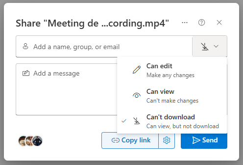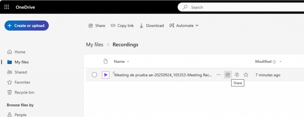 Desde esta carpeta también se puede agregar con quien compartir la grabación y verificar los permisos que tendrá.