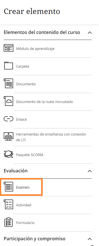 Haga clic en el botón “Crear” (icono +) y seleccione “Examen”.
