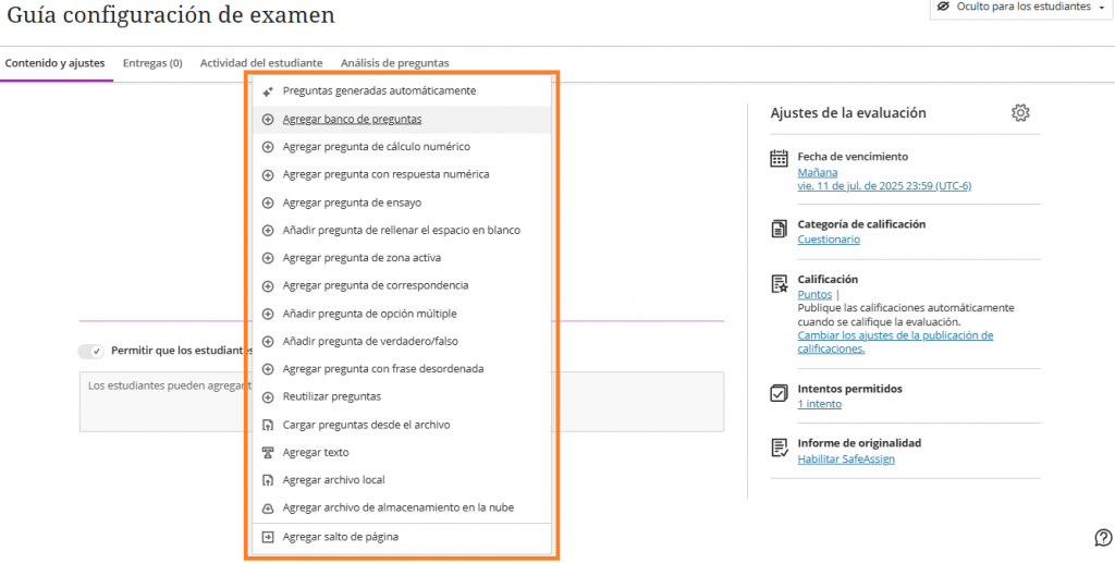 Banco de preguntas: Usar preguntas preexistentes (si está disponible).