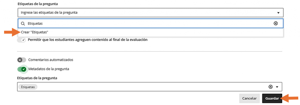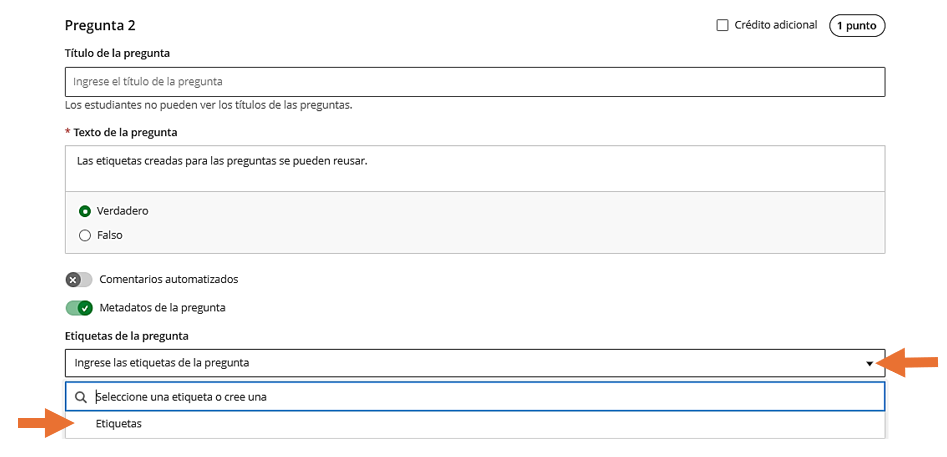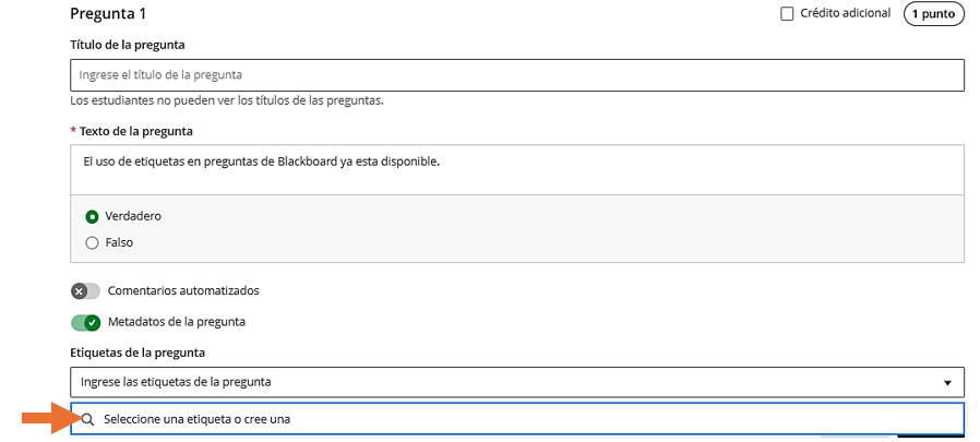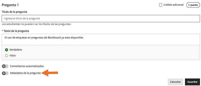 Al crear o editar una pregunta en Blackboard, es posible activar la opción Metadatos de la pregunta y asignarle una etiqueta. Estas etiquetas facilitan la organización ya que se guardan y pueden reutilizarse en otros exámenes o bancos, sin necesidad de volver a crearlas.