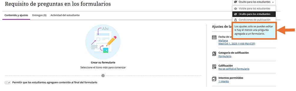 Para que un formulario esté disponible a los estudiantes, es necesario que el profesor agregue al menos una pregunta.