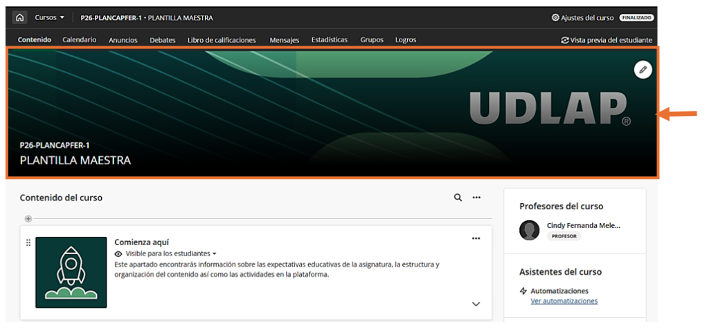 El banner del curso ocupa todo el ancho de la pantalla, con el ID y el título del curso sobre un fondo más oscuro para mayor claridad y accesibilidad. Para mejorar la accesibilidad, recomendamos que la imagen del banner no incluya texto.
