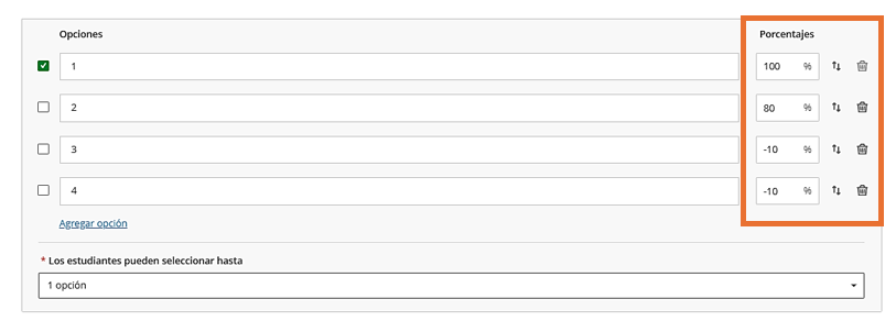 El sistema ahora permite colocar cualquier valor de crédito parcial para cada opción dentro de un rango de -100% a +100%. Ahora también se pueden ingresar valores de crédito positivos para las opciones que no están marcadas como la respuesta correcta.
