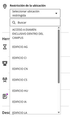 Dentro de los ajustes del examen, desplácese hacia abajo hasta encontrar el apartado Seguridad en las evaluaciones. Ahí encontrará la opción Restricción de la ubicación. Haga clic en el menú desplegable y seleccione el perfil de ubicación disponible para restringir el acceso al examen, puede elegir entre acceso dentro del campus o restringir la ubicación de conexión por edificio.